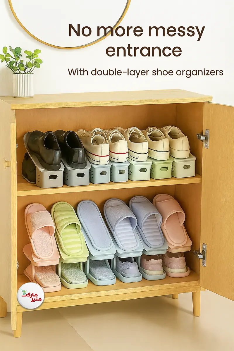 این مدل با طراحی زاویهدار، هر جفت کفش را در دو طبقهی عمودی قرار میدهد و ظرفیت هر طبقه را عملاً دو برابر میکند. سطح آجدار و لبهی نگهدارنده، سرخوردن را کاهش میدهد و برای سایزهای گوناگون مناسب است. اگر به دنبال نظم دهنده کفش داخل کمد هستید، این پایهها در قفسههای با عمق استاندارد به خوبی جا میگیرند و چینش منظم ایجاد میکنند. در صورت نیاز به شستشو، بدنهی نظم دهنده کفش پلاستیکی را با یک دستمال نمدار تمیز میکنید و دوباره استفاده میکنید.